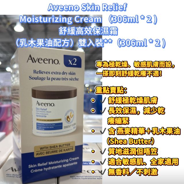Aveeno Skin Relief Moisturizing Cream (306ml * 2 ) 舒緩高效保濕霜(乳木果油配方)|雙入裝**(306ml * 2 )