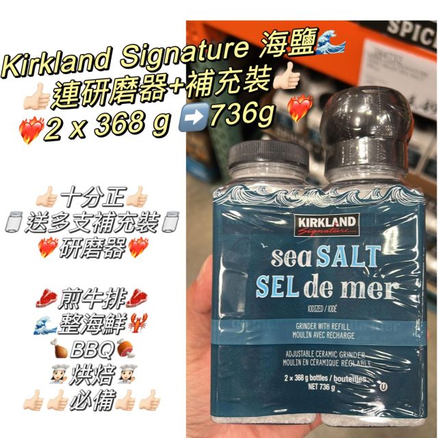 🌊Kirkland Signature sea salt 海鹽🌊 👍🏻連研磨器+補充裝👍🏻 ❤️🔥2 x 368 g ➡️736g ❤️🔥