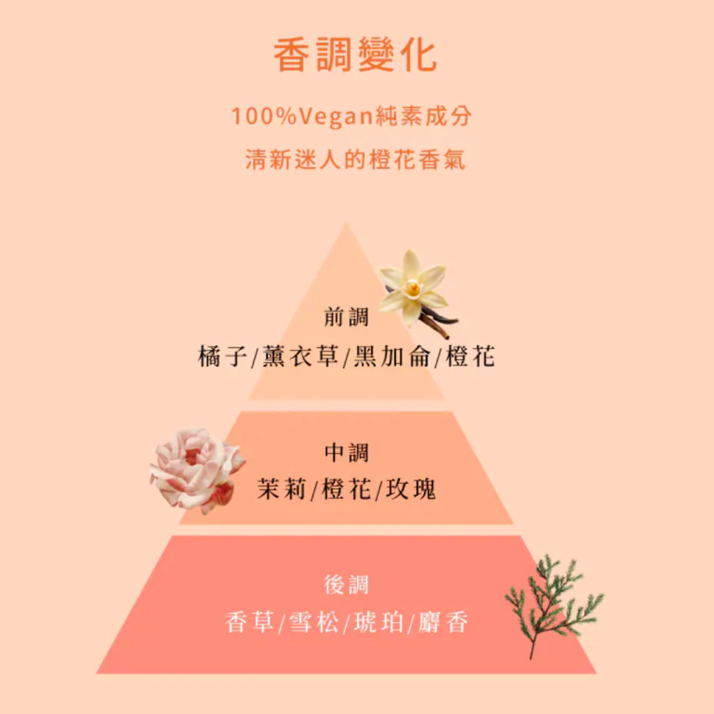• 香味:橙花粉香草(甜甜粉香+橙花+茉莉)