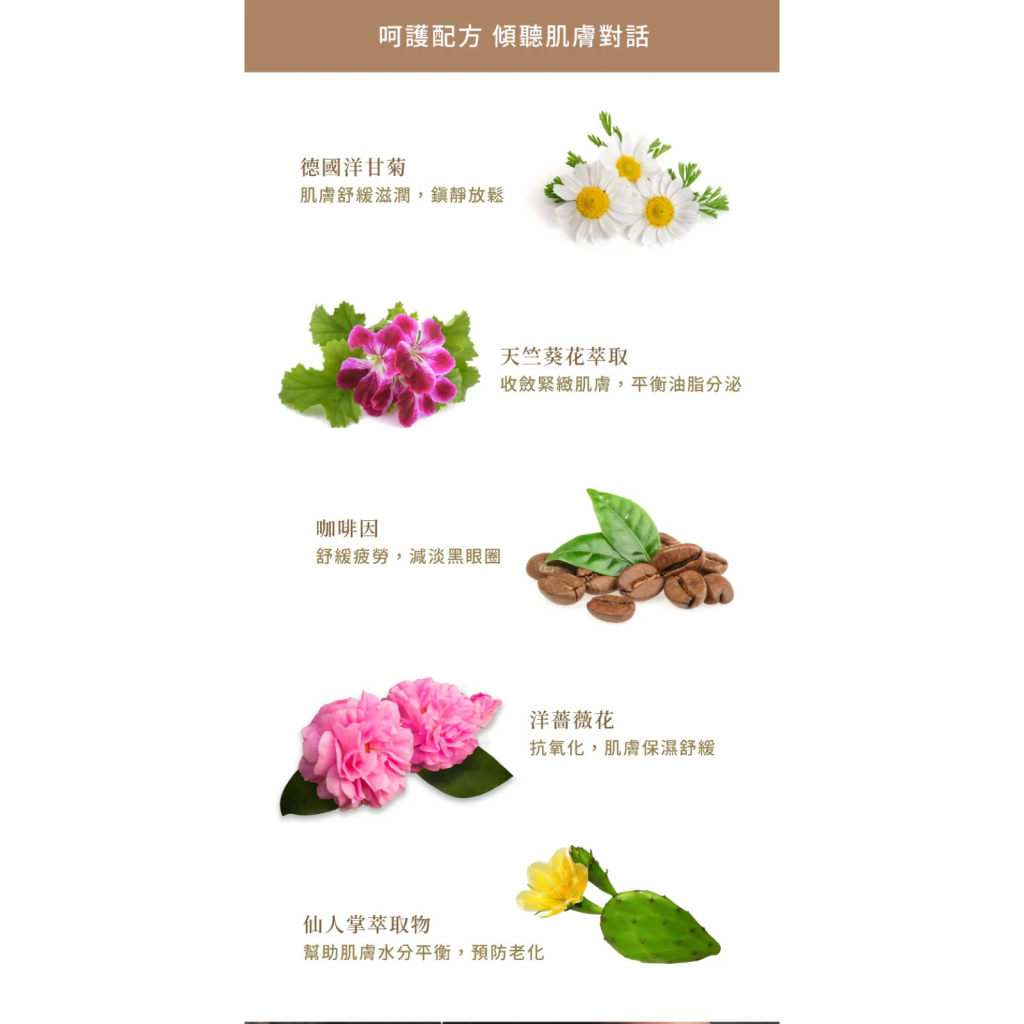 • 咖啡因:舒緩疲勞、改善暗沉