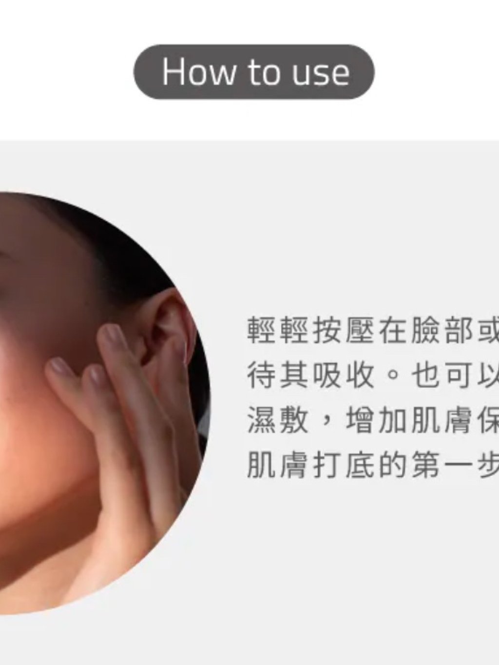 • 輕拍於臉部與頸部,待吸收即可