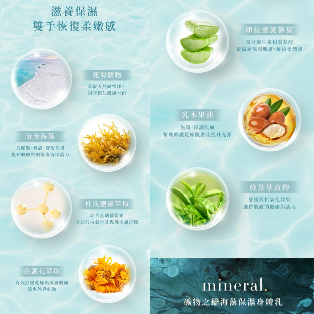 釋放海洋的秘密。這款高保濕潤膚露,讓肌膚更加柔滑細緻。蘊含 AquaBlend Complex 複合配方-獨特的三重海洋能量,蘊含舒緩肌膚的金藻萃取物、有助於保護肌膚免受氧化壓力的杜氏鹽藻萃取物,以及富含礦物質的死海水,為肌膚補水煥活。蘊含超保濕乳木果油、金盞花油、石榴籽油以及舒緩的綠茶萃取物,讓肌膚鎮靜、舒適、水潤。