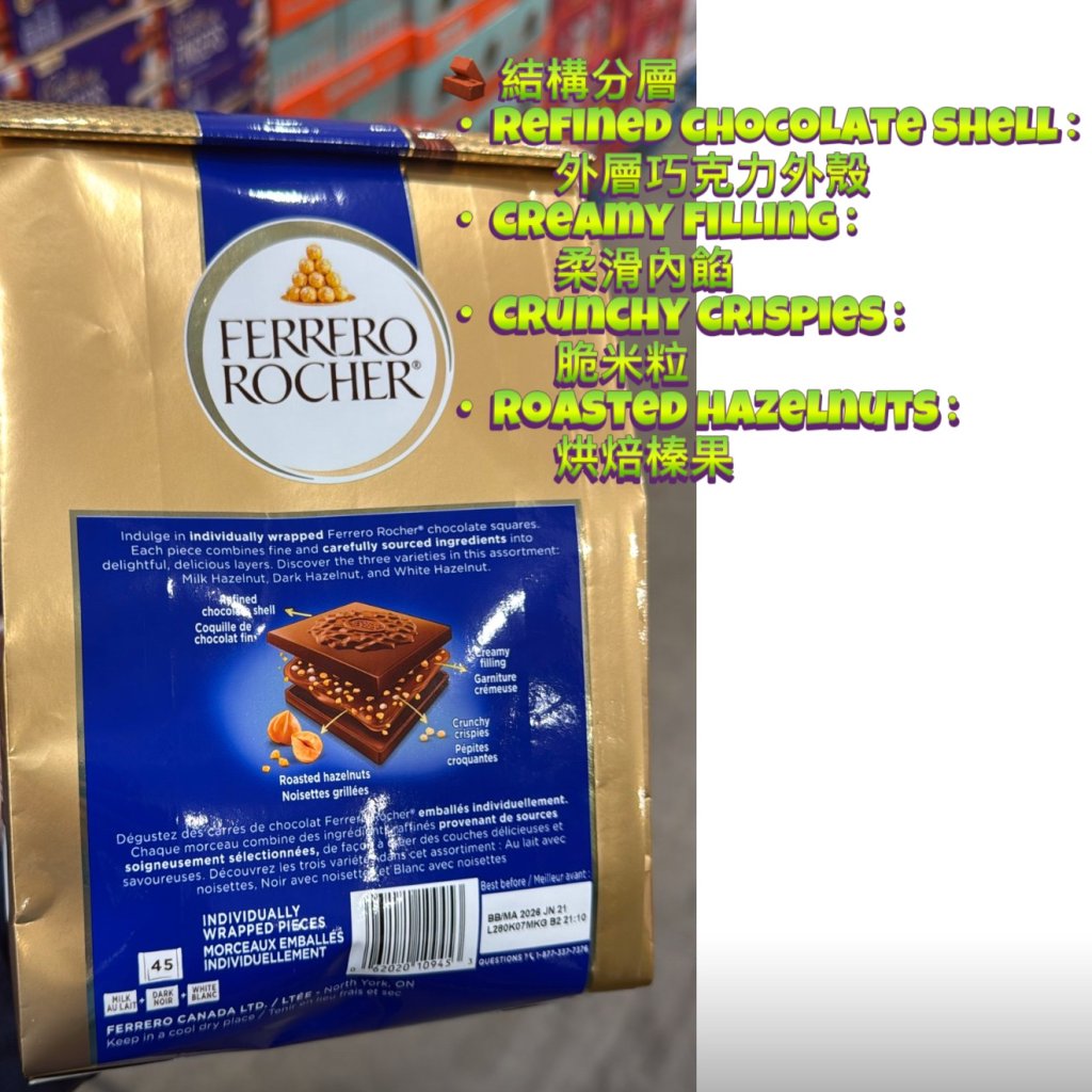 每一顆都是 獨立包裝 (Individually Wrapped Pieces) 的巧克力方塊,結合了精選原料與多層美味口感。