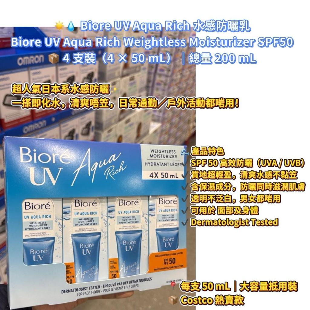 ☀️💧 Biore UV Aqua Rich 水感防曬乳 Biore UV Aqua Rich Weightless Moisturizer SPF50 📦 4 支裝(4 × 50 mL)|總量 200 mL