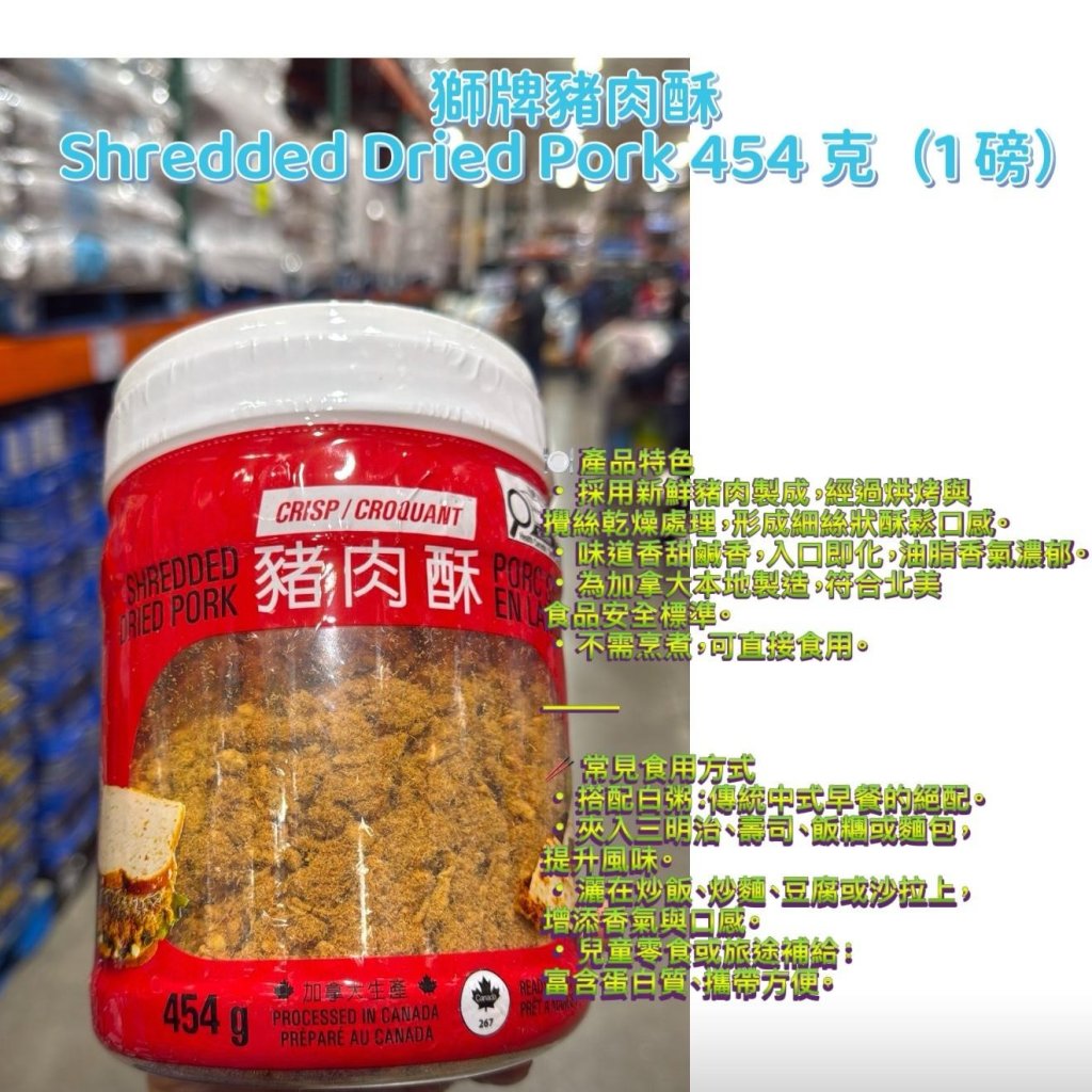 •採用新鮮豬肉製成,經過烘烤與攪絲乾燥處理,形成細絲狀酥鬆口感。