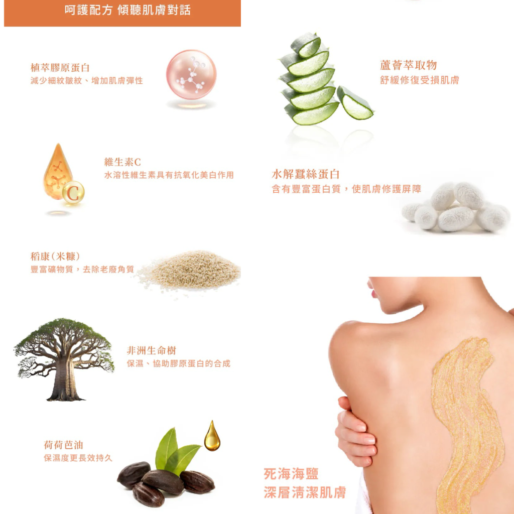 釋放自然光彩的好處。這款充滿活力的身體磨砂膏富含來自可持續植物來源的純素膠原蛋白,並與維生素 C 相結合,可撫平肌膚、恢復活力,並富含抗氧化劑。蘆薈葉汁、葡萄籽油、荷荷巴油和金盞花油的混合物可滋養並改善皮膚彈性。富含羅勒萃取物,可緊緻、煥發肌膚並賦予肌膚活力。 使用說明:以打圈方式輕輕按摩濕肌膚。徹底沖洗。請勿用於面部。