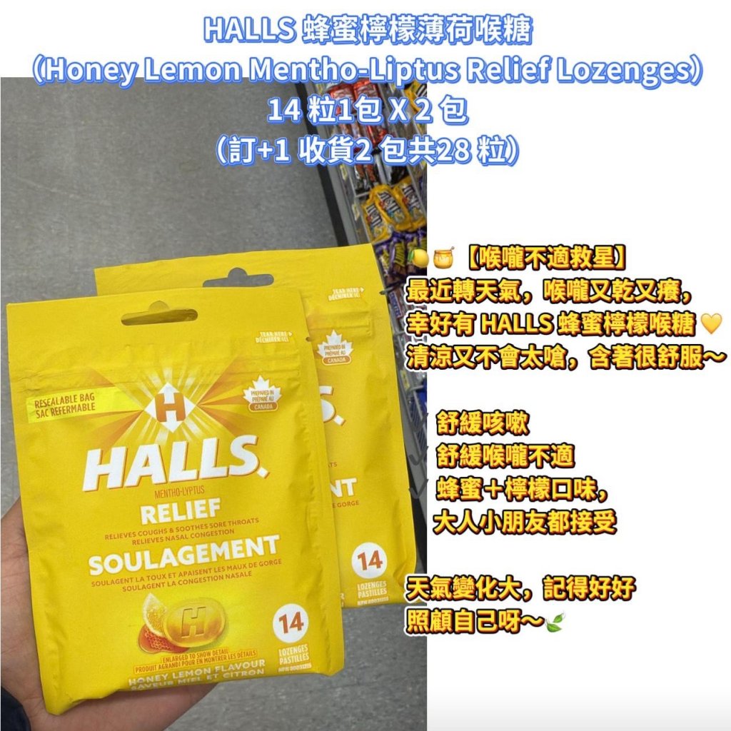 HALLS 蜂蜜檸檬薄荷喉糖 (Honey Lemon Mentho-Liptus Relief Lozenges) 14 粒/包 × 2 包