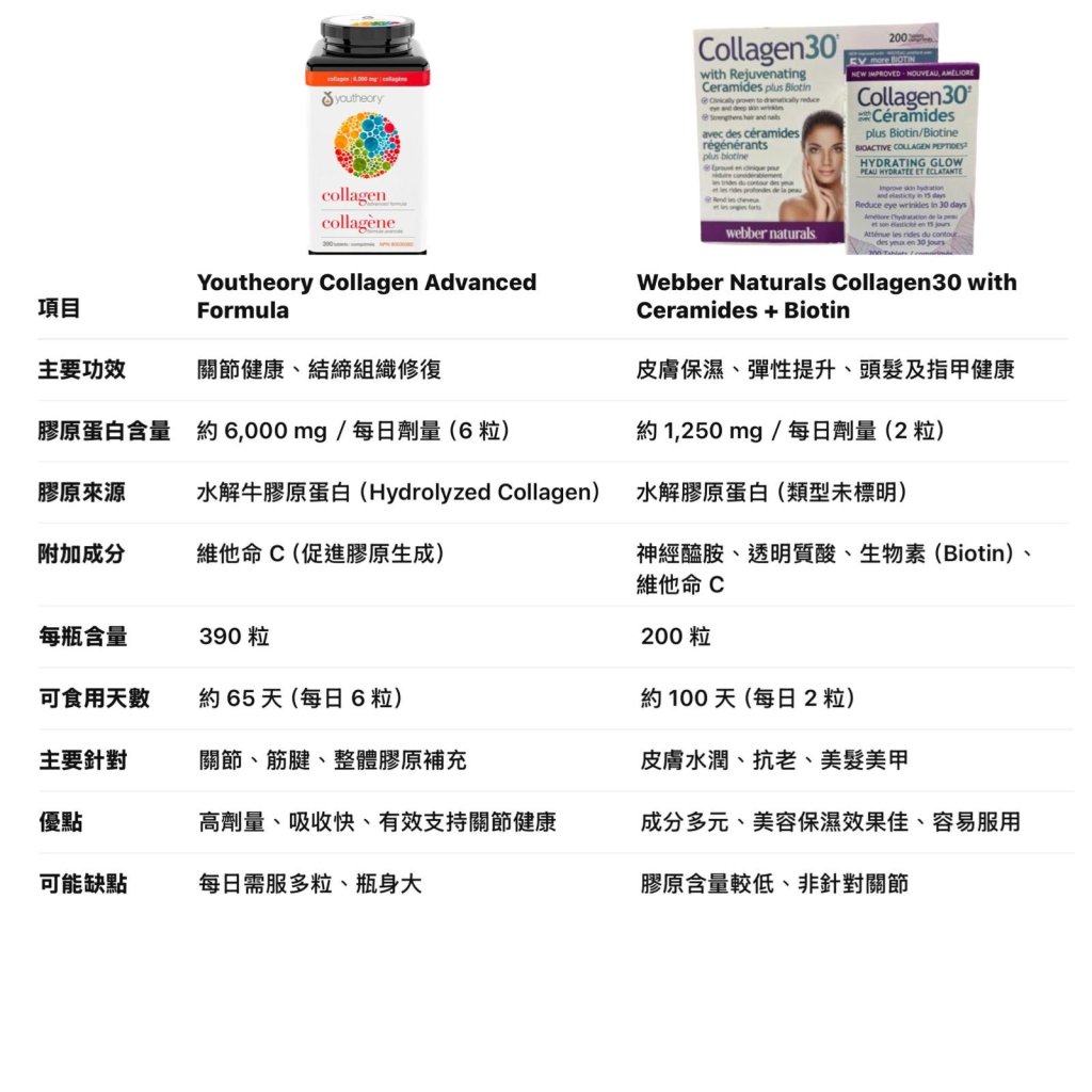 放心,雖然 Webber Naturals 呢款每日劑量係大約 1,250 毫克膠原蛋白,但佢嘅配方係專門針對皮膚、頭髮同指甲嘅日常護理嘅。因為佢加入咗神經醯胺、透明質酸同埋生物素呢啲美容成分,所以即使膠原含量冇咁高,都一樣可以幫你提升皮膚嘅水潤度、彈性同埋美髮美甲嘅效果。