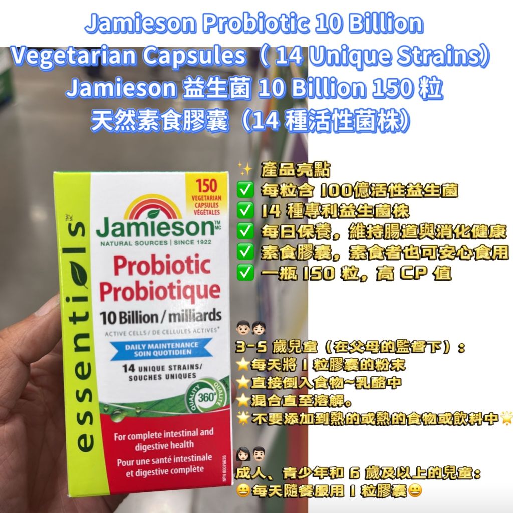 Jamieson Probiotic 10 Billion Vegetarian Capsules( 14 Unique Strains)Jamieson 益生菌 10 Billion 150 粒 天然素食膠囊(14 種活性菌株)