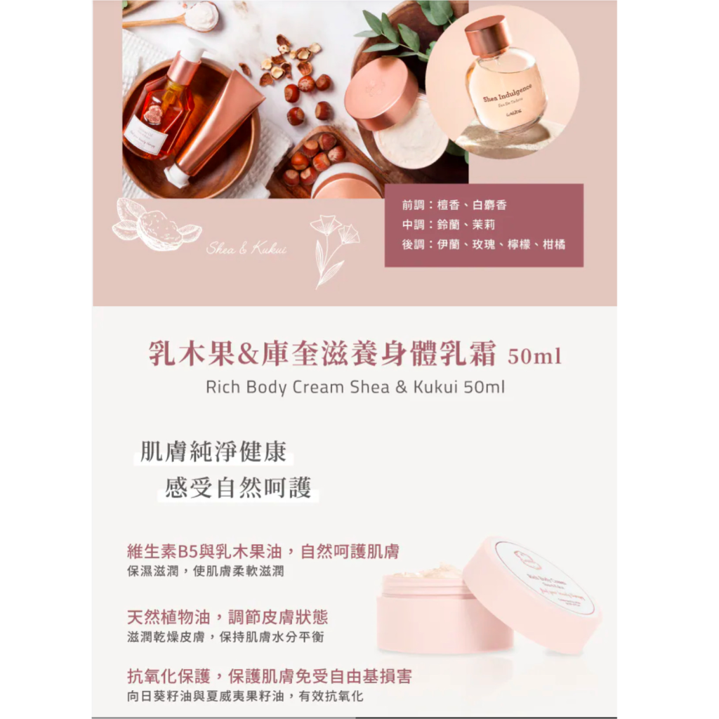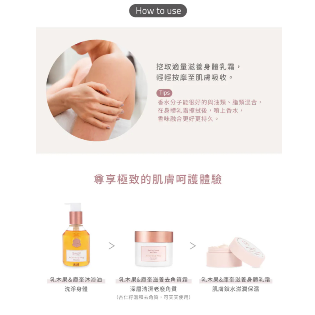 乳木果油和庫奎的夢幻注入 // 這款奢華、保濕和滋養的身體霜富含乳木果油和可可脂以及庫庫伊和澳洲堅果油。這款優質保濕霜有助於滋養肌膚,讓肌膚感覺絲滑、容光煥發。含有維生素 E 和死海礦物質。