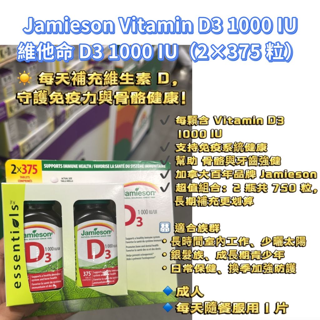 Jamieson Vitamin D3 1000 IU 維他命 D3 1000 IU(2×375 粒)